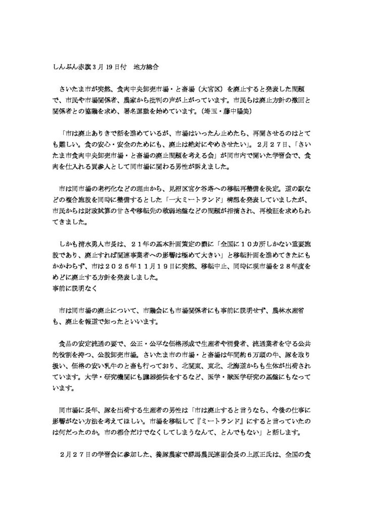 鳥羽めぐみさいたま市議は、突然のと畜場廃止の経過を語り、3月に市と県が協議を行ったはずだとしてその内容の説明を求めました。